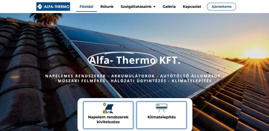A weboldal célja: Az Alfa-Thermo egy klímákkal és napelemekkel foglalkozó vállalkozás.