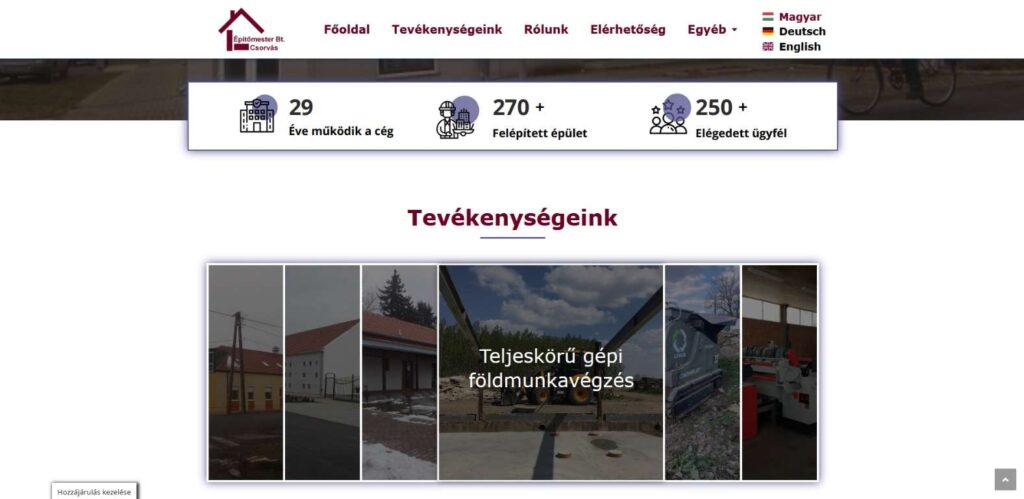 A weboldal célja: Építőipari vállalkozás bemutatása több nyelven.